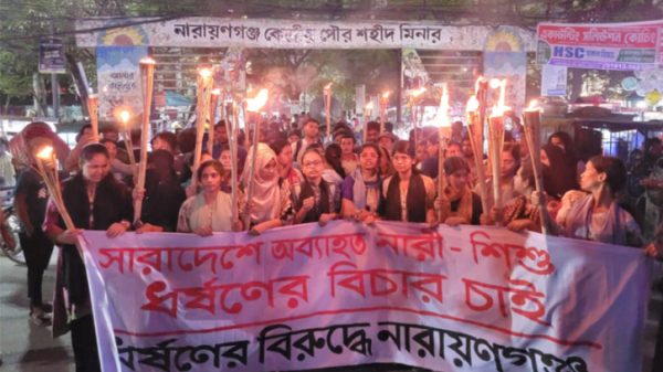 সারাদেশে নারী-শিশু ধর্ষণ, নিপীড়ন ও নির্যাতনের প্রতিবাদে শহরের মশাল মিছিল করেছে সাধারণ শিক্ষার্থীসহ বিভিন্ন শ্রেণিপেশার নারী পুরুষ। রোববার (৯ মার্চ) সন্ধ্যা সাতটায় ‘ধর্ষণের বিরুদ্ধে নারায়ণগঞ্জ’ ব্যানারে এ মিছিল বের হয়।